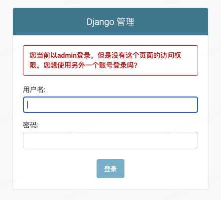 当通过将User中的user_permissions设置为None的方式来移除Django默认创建的表时. 如果一个已经登录过AdminSite站点的用户,从超级用户变为普通用户后,没有清理Cookie就去访问Admin站点会报错(预期效果如下图).原因是此时用户是is_authenticated的,从而绕过了has_permission的检查.对于普通用户,AdminSite类中的get_app_list方法内部调用的has_module_permission会尝试访问user_user_permissions从而导致报错;对于超级用户,has_module_permission则会直接返回为True. 可以通过重写AdminSite的get_app_list方法来解决. 1 2 3 4 5 6 class MyAdminSite (admin.AdminSite): ... def get_app_list (self, request: WSGIRequest ): if request.user.is_superuser is False : return [] return super ().get_app_list(request)