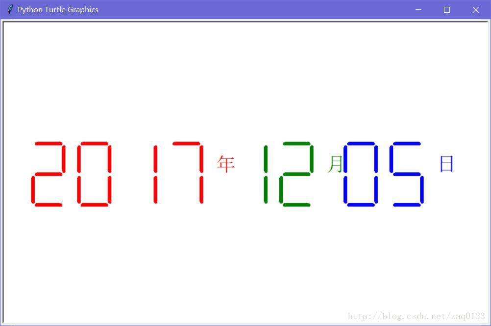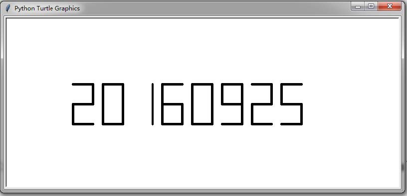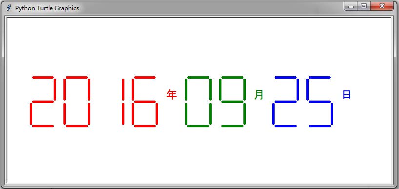 def drawdata(data): turtle.color("red") for i in data: if i=='+': turtle.write('年',font=("宋体", 24, "normal")) turtle.color("green") turtle.fd(30) elif i=='-': turtle.write('月',font=("宋体", 24, "normal")) turtle.color("blue") turtle.fd(30) elif i=='*': turtle.write('日',font=("宋体", 24, "normal")) else: drawdight(eval(i)) def main(): turtle.setup(800,500) turtle.penup() turtle.fd(-350) turtle.pendown() turtle.hideturtle() turtle.pensize(6) turtle.speed(9) drawdata(datetime.datetime.now().strftime('%Y+%m-%d*')) a=input() main()